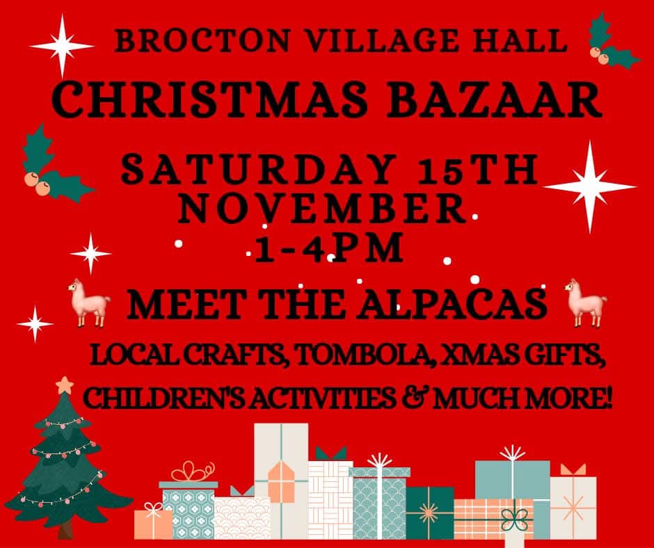 Tombola, Bric-a-Brac, Cake and Home Produce Stall, Book Stall, Children’s Tombola, Wood Turning, Christmas Raffle, Christmas Cards, Refreshments, Alpacas and more. Further info: [email protected]
